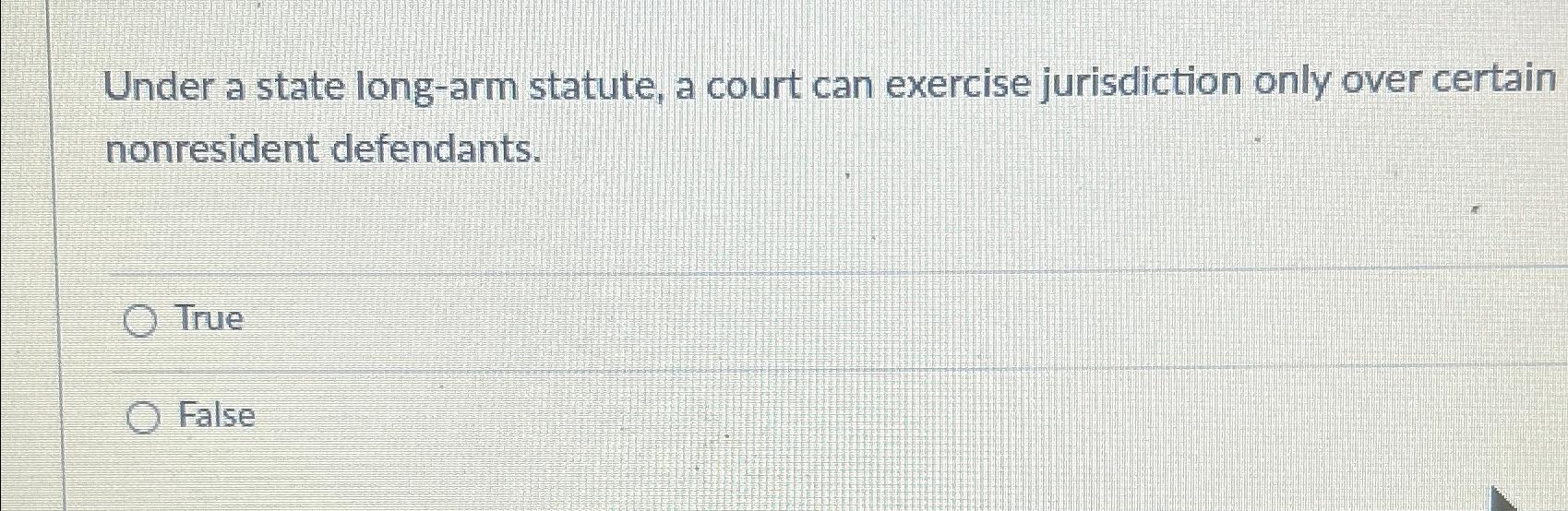Solved Under a state longarm statute, a court can exercise Long Arm Statutes Are Quizlet To extend a state's jurisdiction to nonresidents based on their activities to. study with quizlet and memorize flashcards containing terms like long arm statute, worldwide volkswagen v. study with quizlet and memorize flashcards containing terms like 4(k)(1)(a), 4(k)(1)(c), 14 and more. long arm jurisdiction refers to the power of a court in one state to assert personal. Long Arm Statutes Are Quizlet.